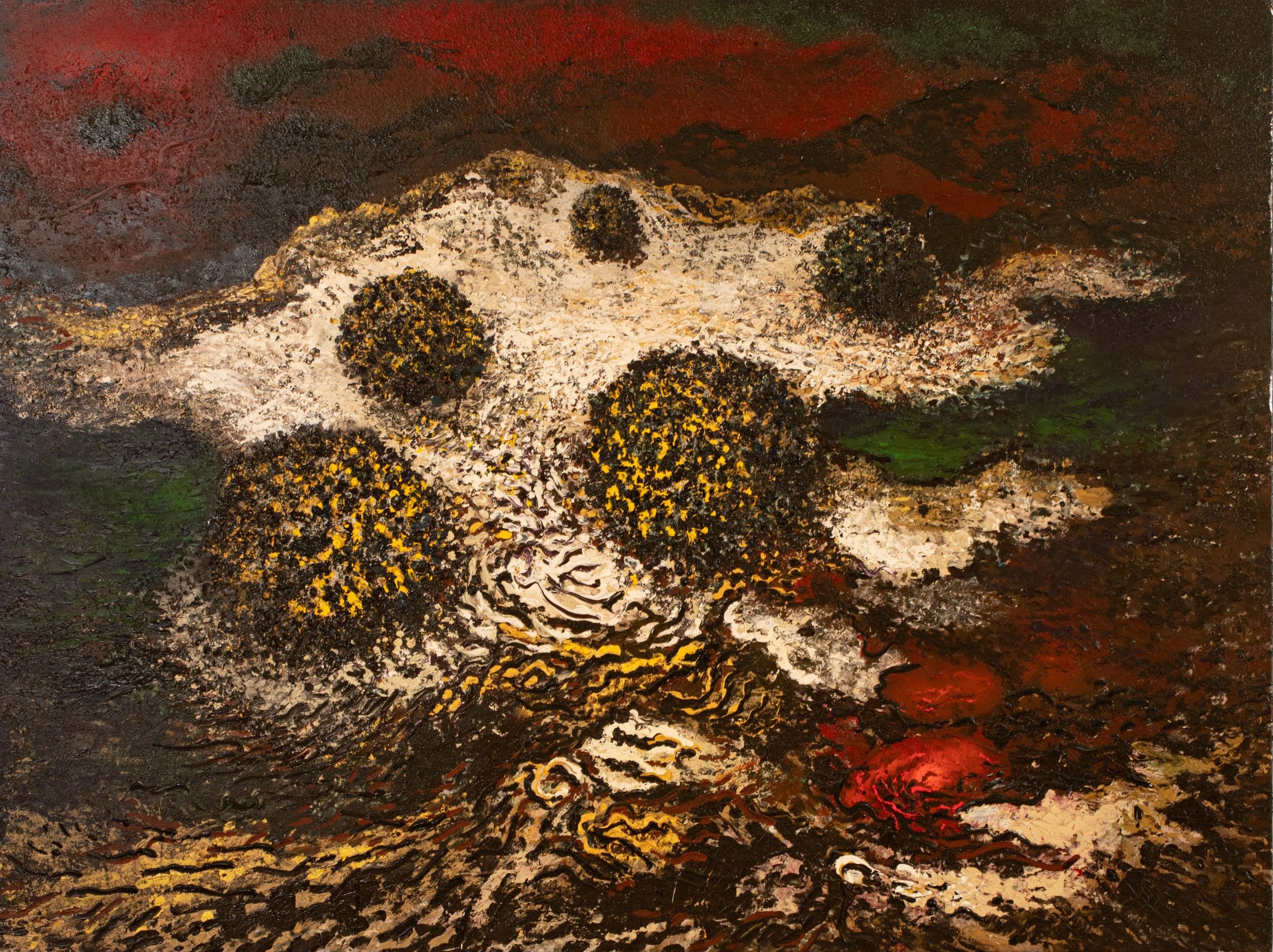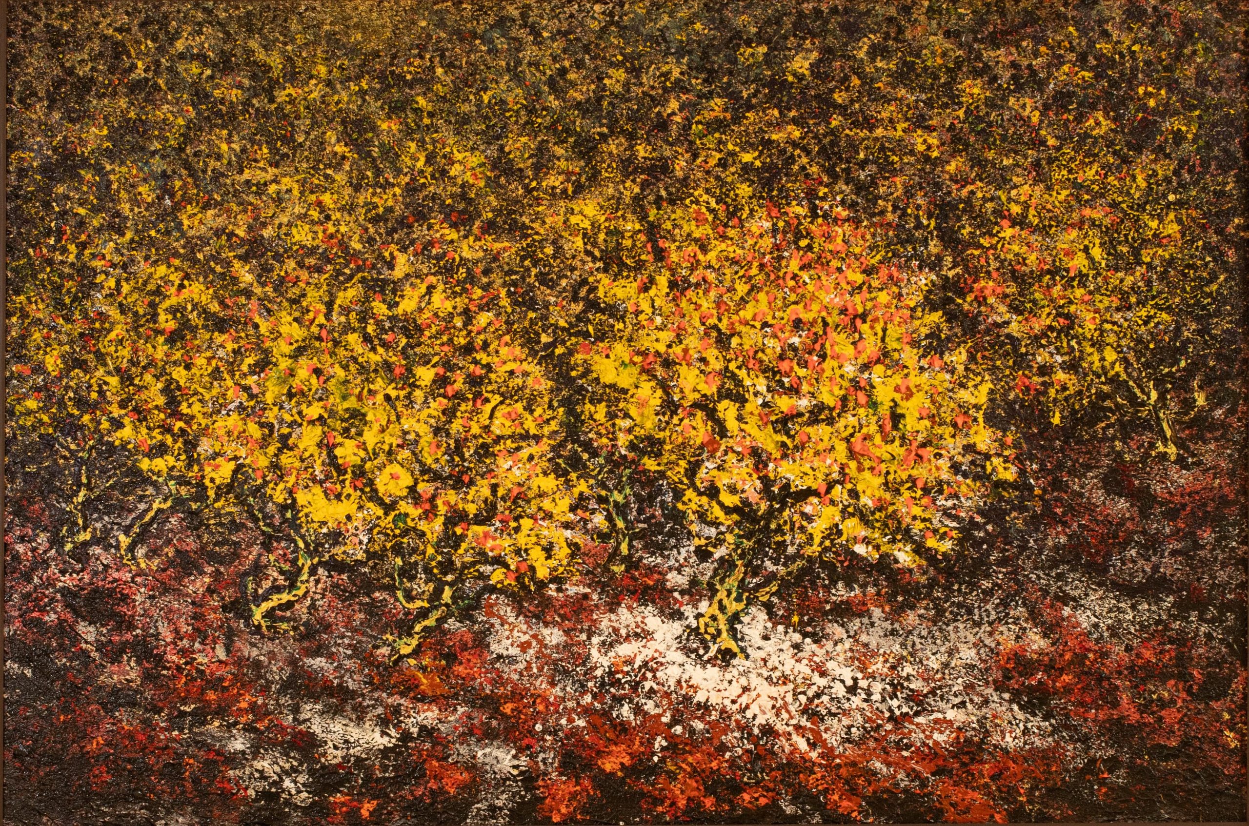 A vibrant blue tree rises against a sweeping backdrop of golden hills and an open sky. The canvas is alive with countless textured strokes, creating a shimmering field of colour that feels both grounded and luminous. The contrast between the deep azure foliage and the warm yellows and reds surrounding it evokes a sense of calm resilience amid abundance. Layered impasto and impressionistic detailing give the landscape a rhythmic, almost musical energy.