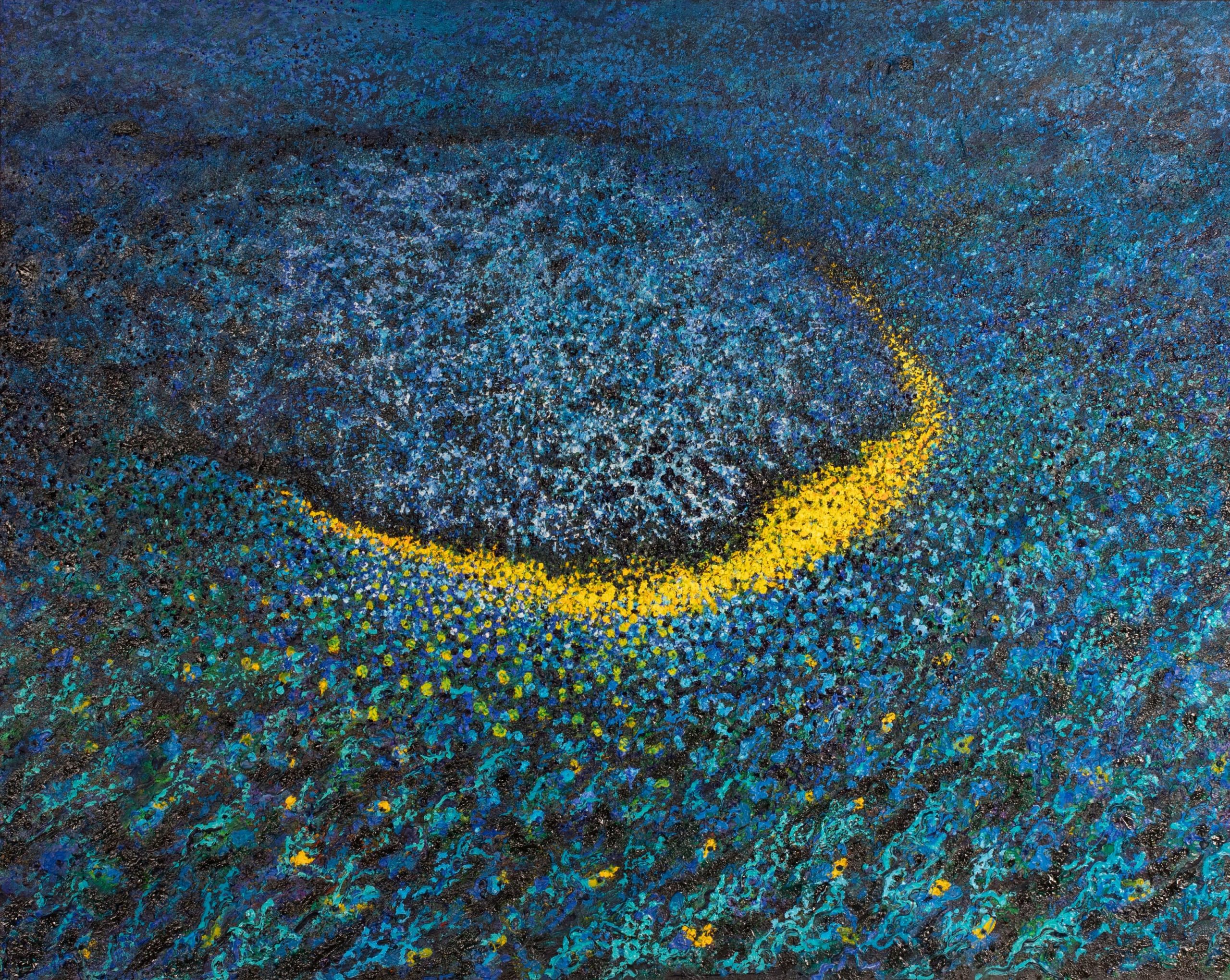 Only an assured hand can orchestrate such color without losing harmony. A swirling crimson sky crowns a field alive with layered blues, greens, and bursts of floral color, unfolding across a 36 × 48 inch canvas. The surface moves between rhythm and release, suggesting a landscape suspended between energy and calm.